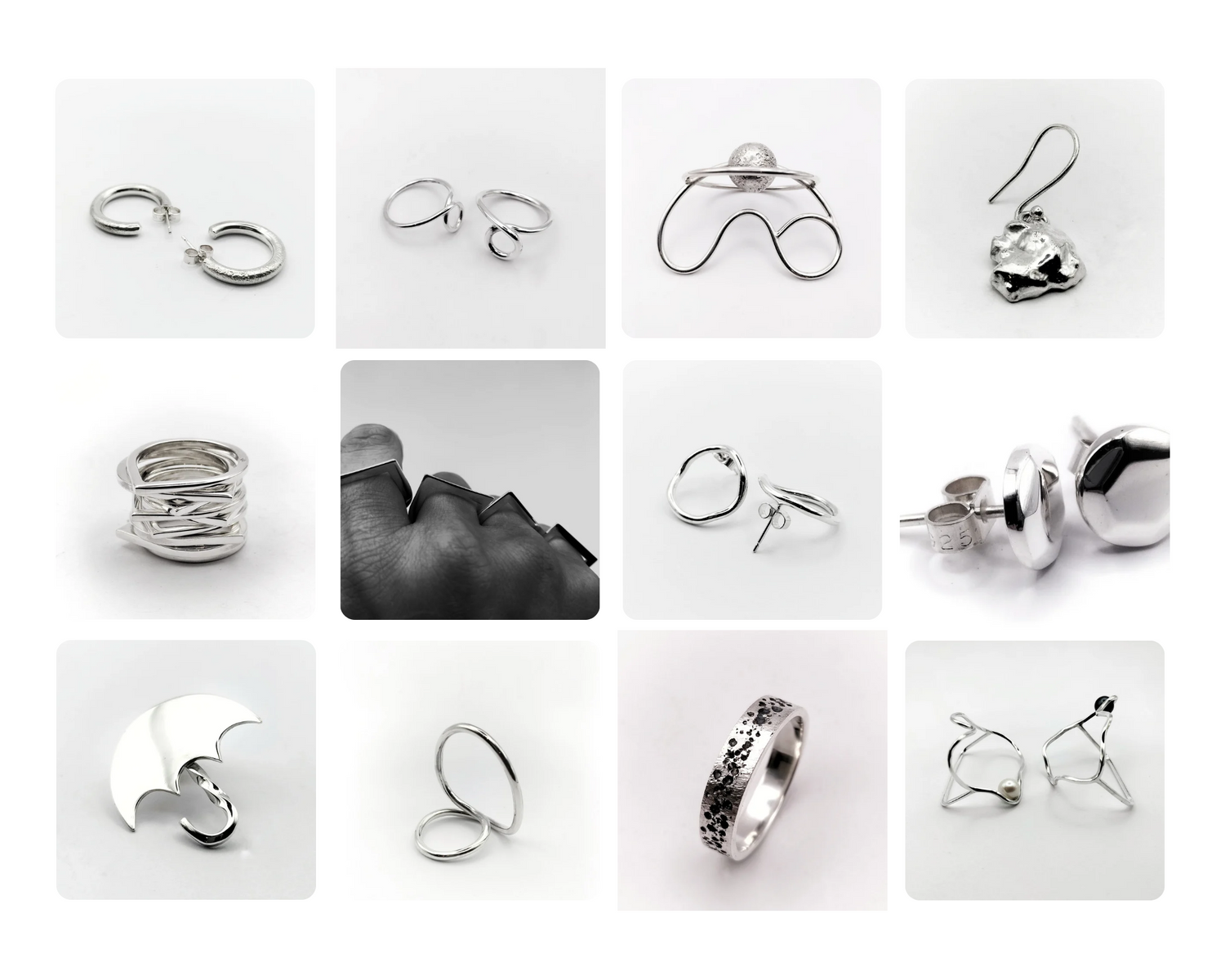 Ce sont des bijoux contemporains en argent massif complètement mixtes. J’aime m'inspirer du système solaire et intégrer du mouvement dans mes créations. Mes pièces sont souvent imposantes et non conformistes, tantôt figuratives tantôt abstraites où la torsion du métal s’exprime.